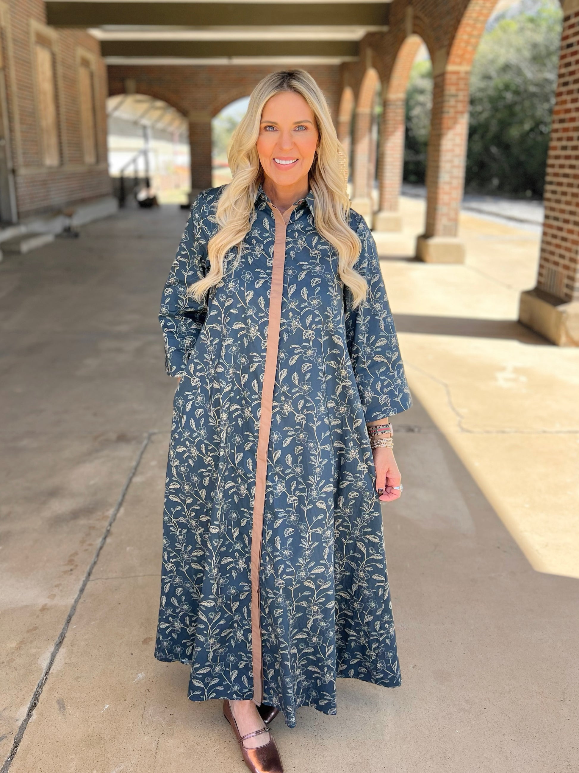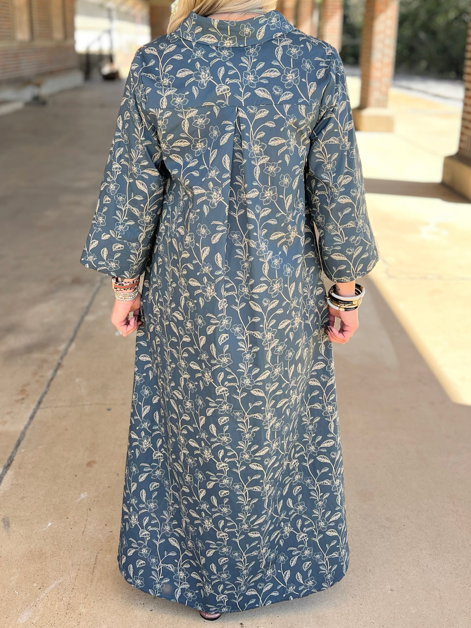 Floral print 3/4 sleeve midi dress featuring hidden button closure at front. Shirt collar. Side pockets.