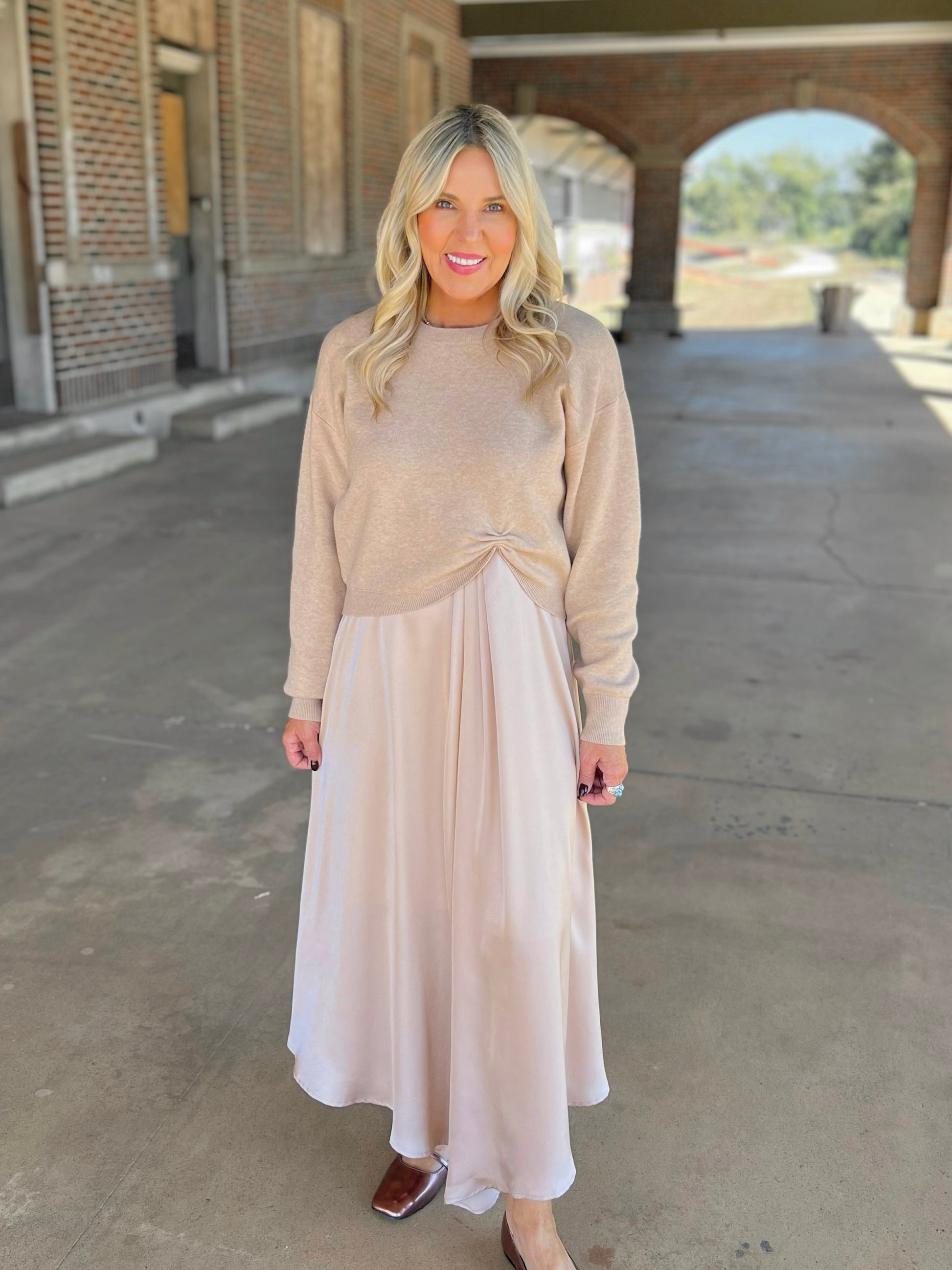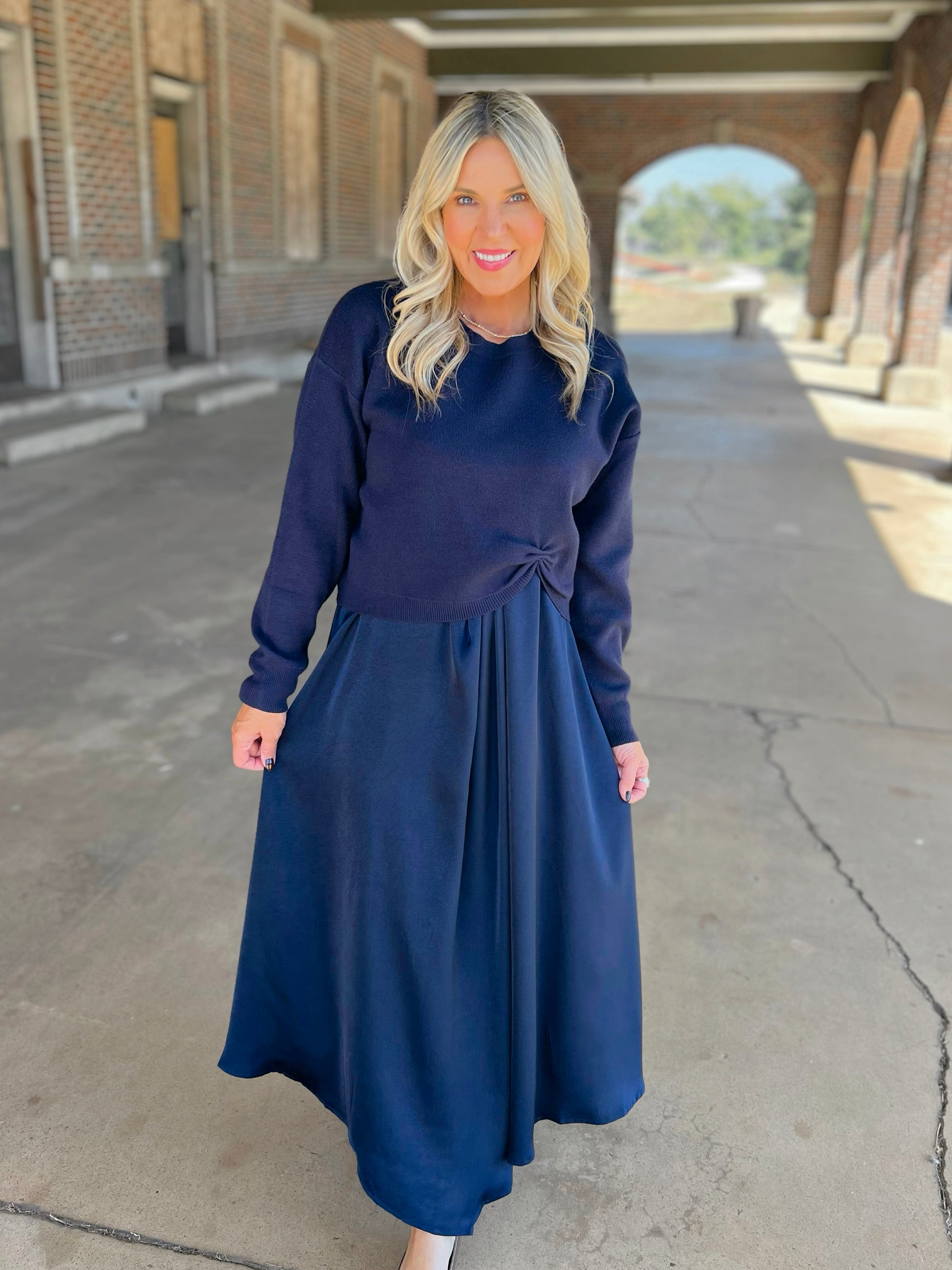 Includes a long sleeves soft texture sweater top with knot accent, drop shoulder.