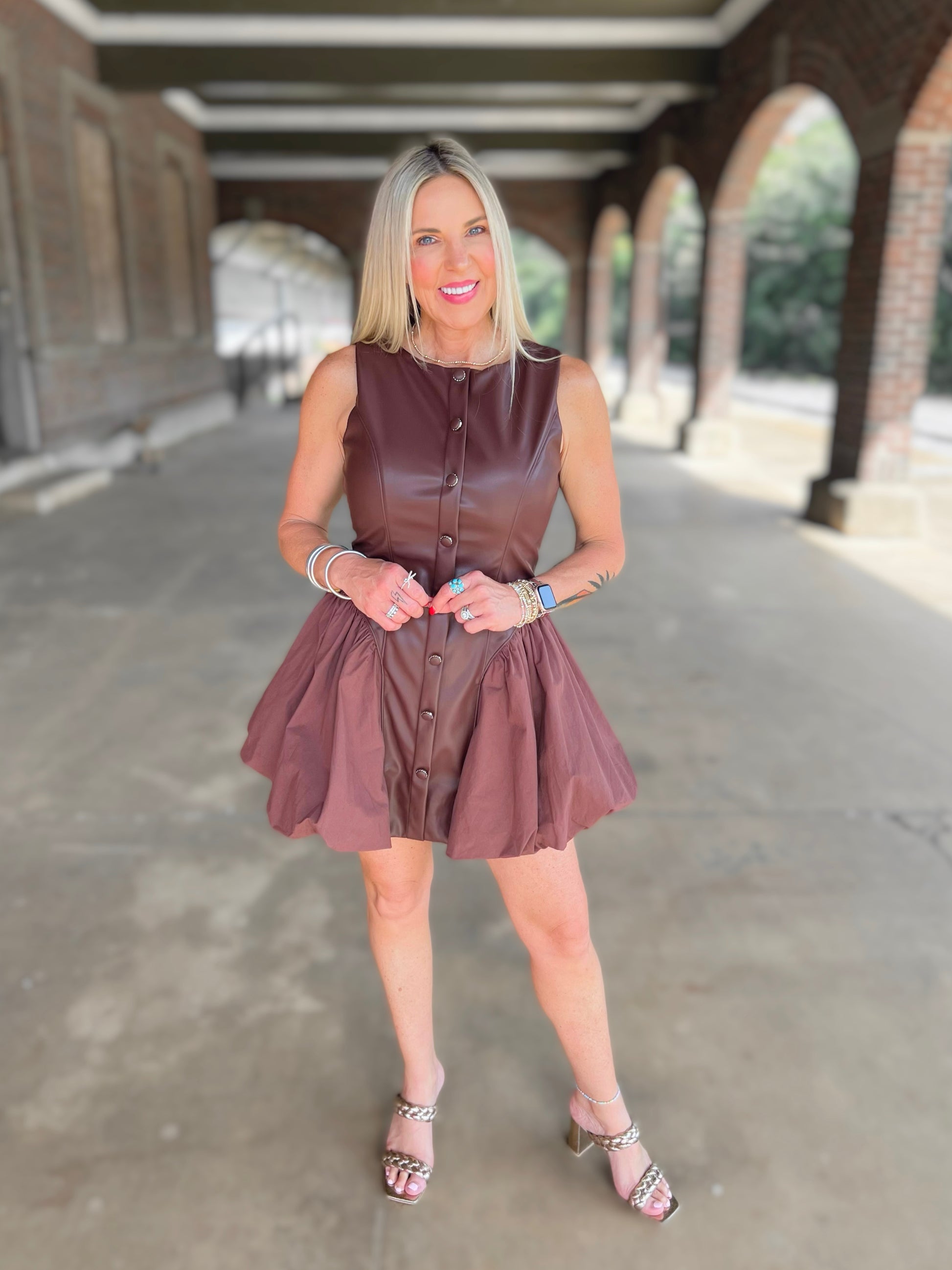 Button down detail bubble mini dress in faux leather and cotton poplin fabric. This sleeveless babydoll mini dress features bubble side panel in poplin fabric, faux leather bodice with button down detail, round neck, lining, and hidden zipper closure.