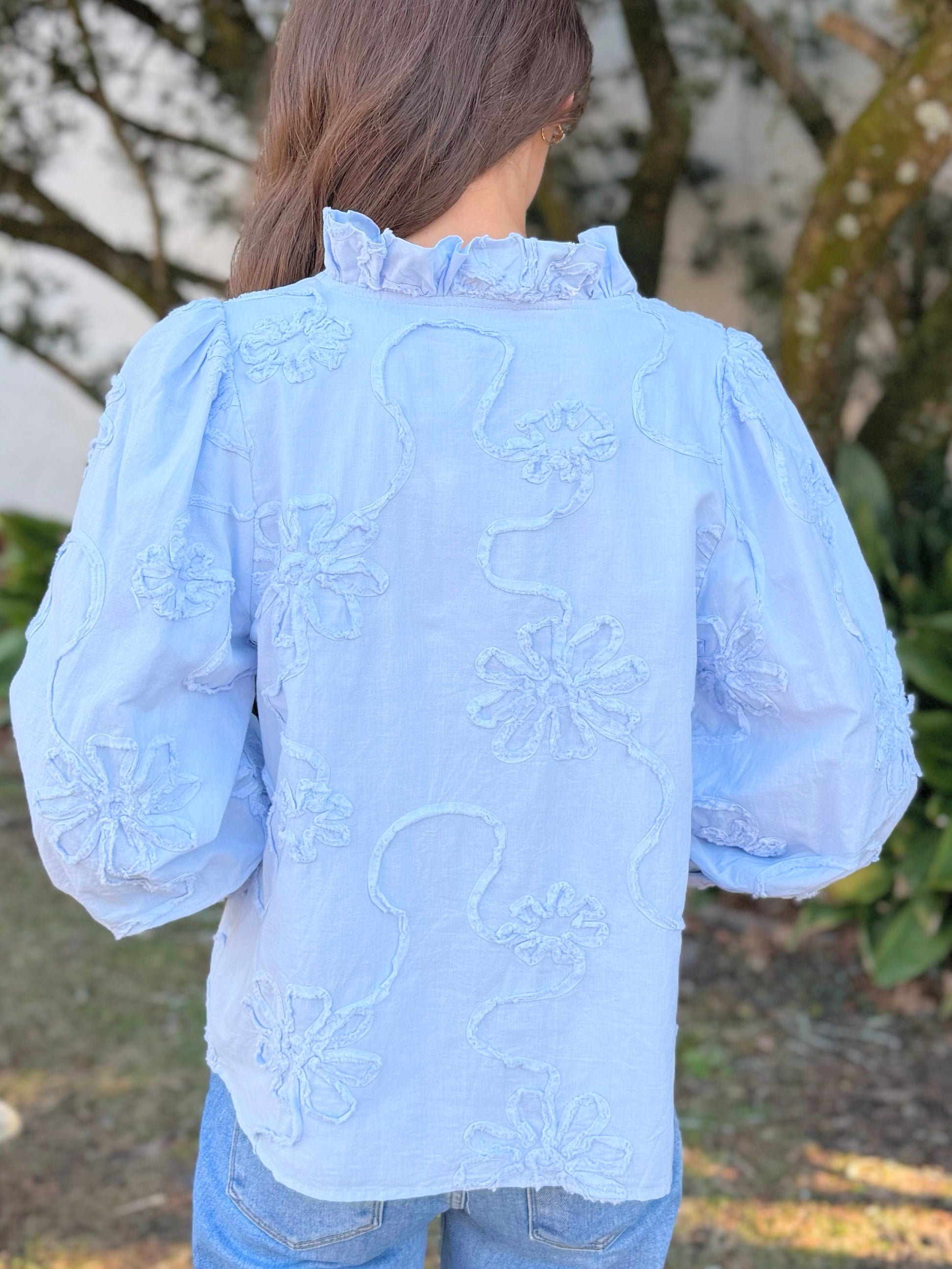 3D Floral top with textured fabric. Ruffled neckline.