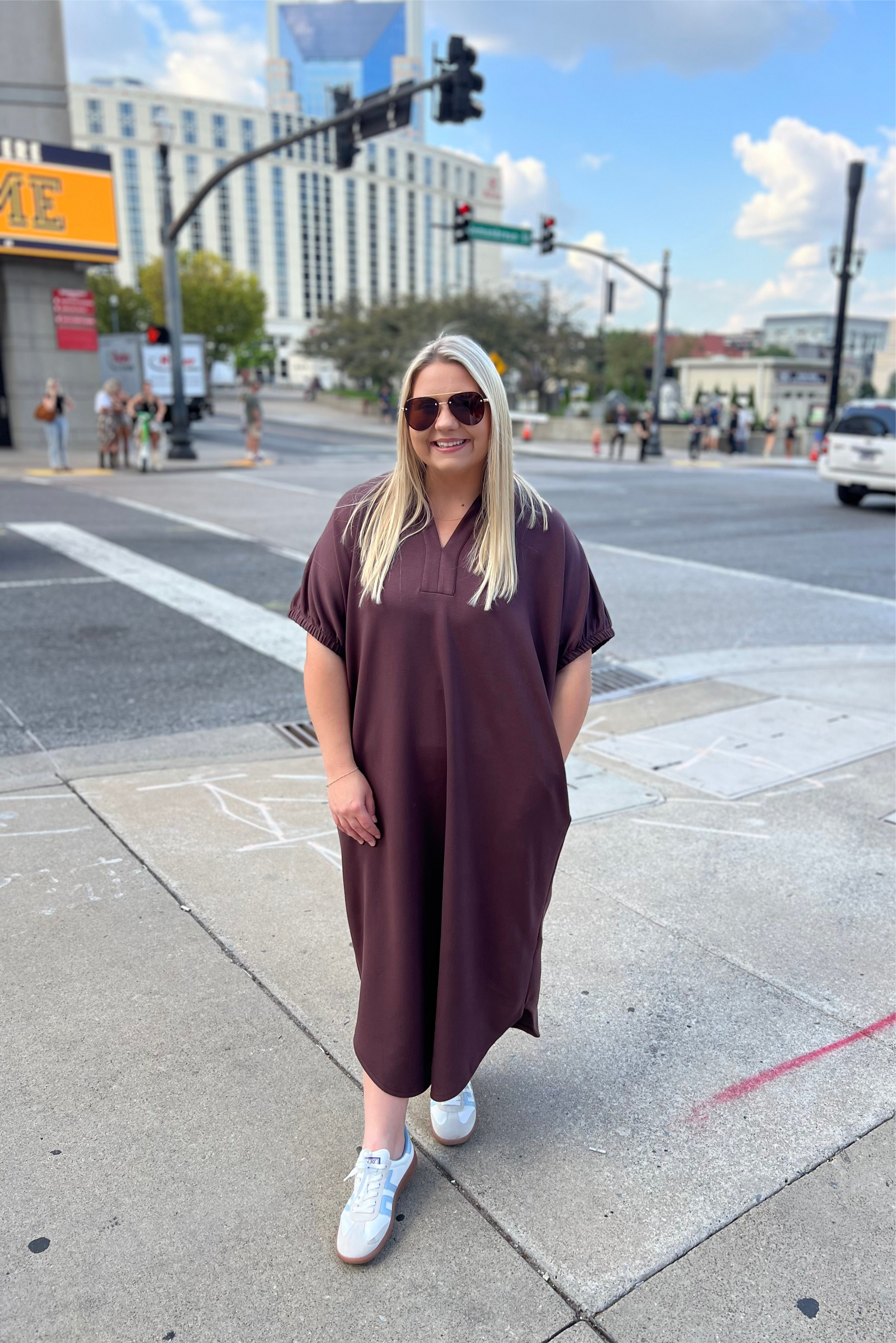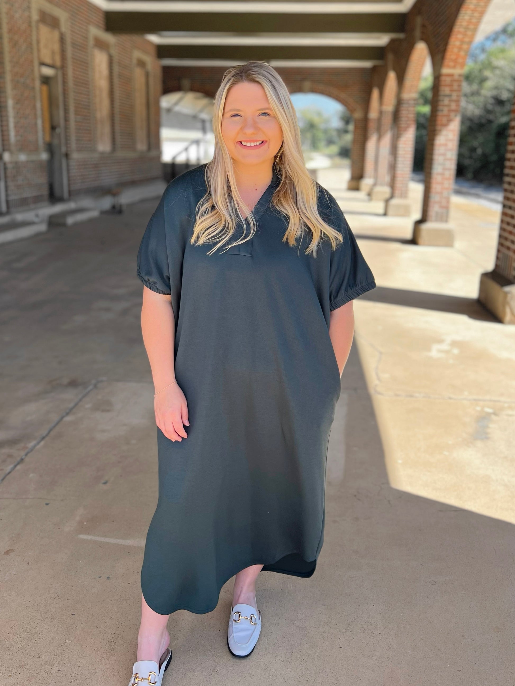 Solid short sleeve midi dress featuring band collar V-neck and elasticated sleeve openings. Side pockets.
