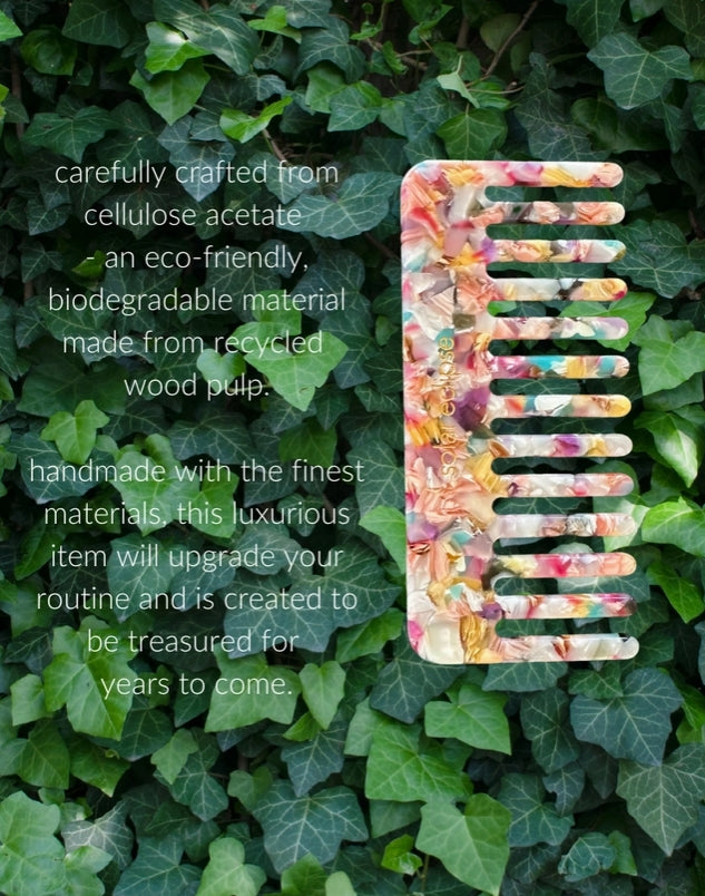 Our gentle wide-tooth comb that effortlessly glides through wet and dry hair to detangle without causing breakage. Crafted in small batches, it's designed to upgrade your routine and be treasured for years to come. Designed in New York City, this gentle wide-tooth comb is designed to promote hair health by removing tangles from all hair types and textures. It's perfect for safely detangling without causing breakage, massaging the scalp and increasing circulation to nourish the roots and promote hair growth. Crafted with our signature biodegradable acetate made from recycled wood pulp, it effortlessly glides for a static-free experience with wet and dry hair.