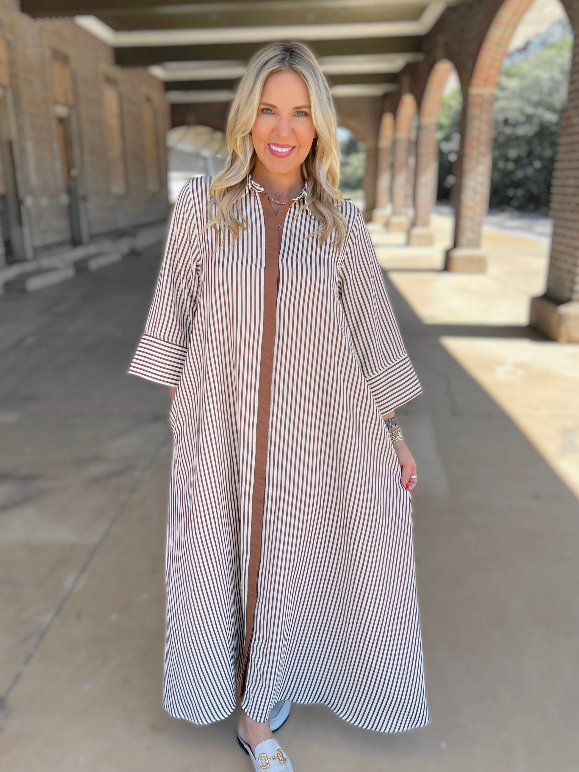 Striped 3/4 sleeve Midi dress featuring hidden button closure at front. Shirt collar. Side pockets. Unlined. Woven. Non-sheer. Lightweight.