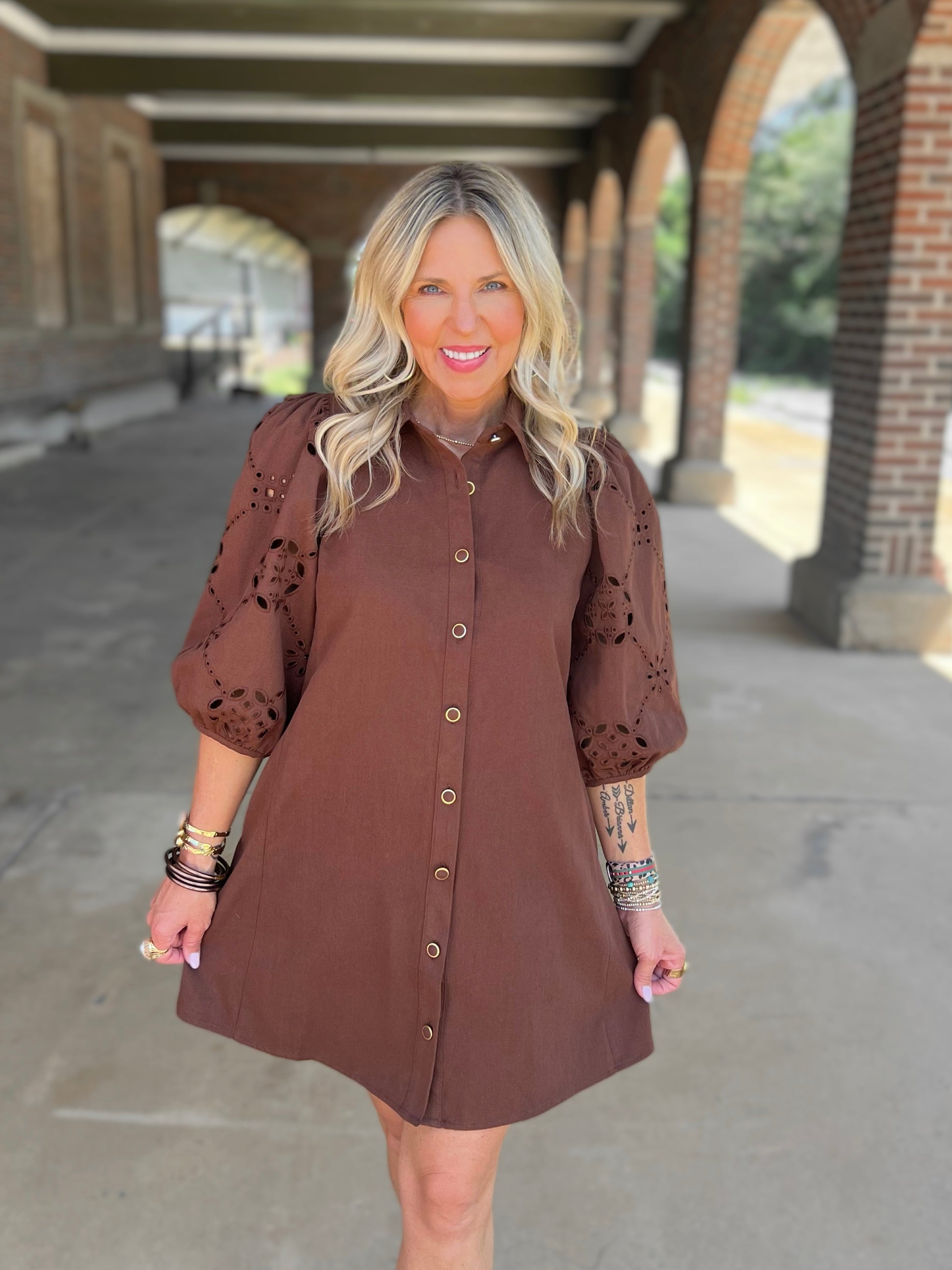 Solid eyelet ¾ puff sleeve mini dress featuring shirt collar and elasticated sleeve opening. Button closure at front.