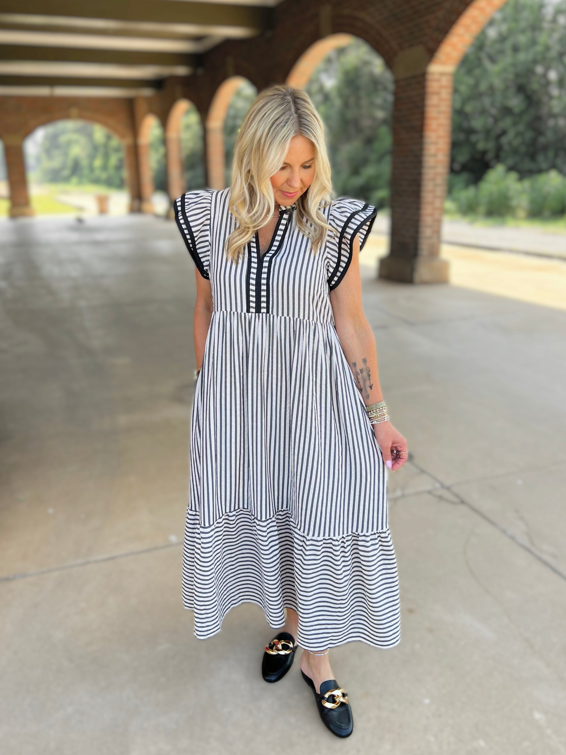 Textured stripe pattern tiered ruffle flutter sleeve featuring contrast accent binding detail. Side pockets. Lined. Woven. Non-sheer. Lightweight.