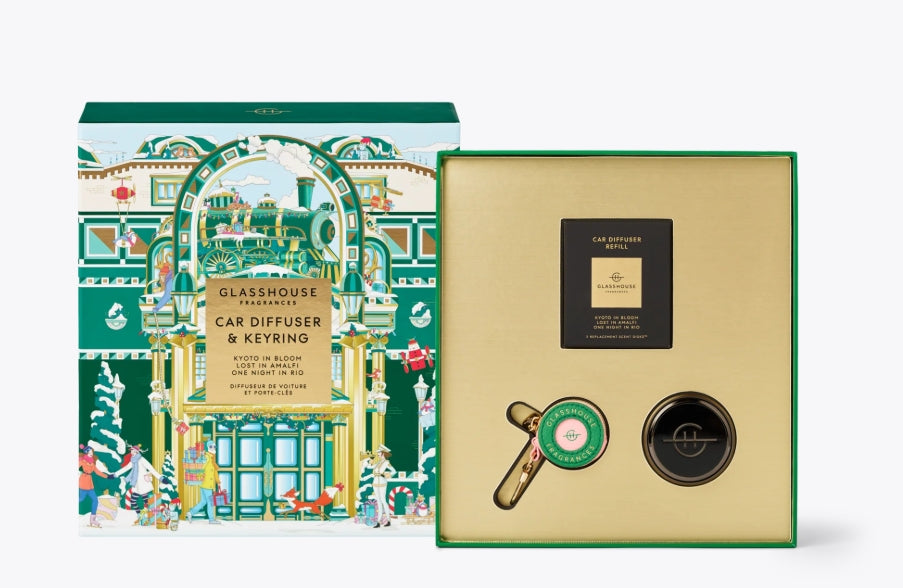 Includes: 1 x Black Refillable Car Diffuser, 3 x Scent Disk™ Refills (Kyoto In Bloom, Lost In Amalfi & One Night In Rio), 1 x Keyring in a Gift Box with illustrations by Aeoniumsky.
