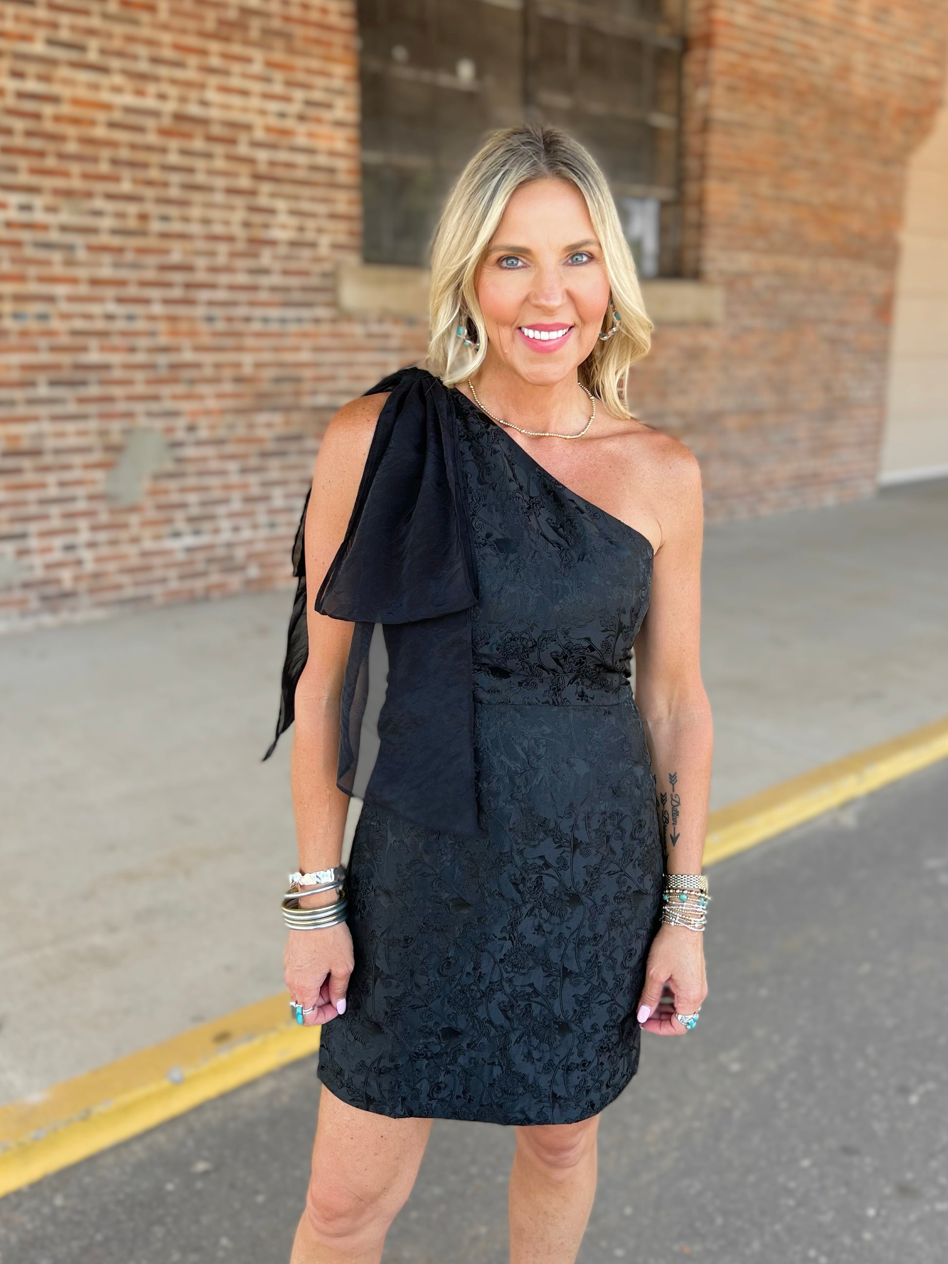 The Henefer Floral One Shoulder Mini Dress features a one shoulder sleeve with a sheer bow on top and a beautiful contrasting floral print throughout.