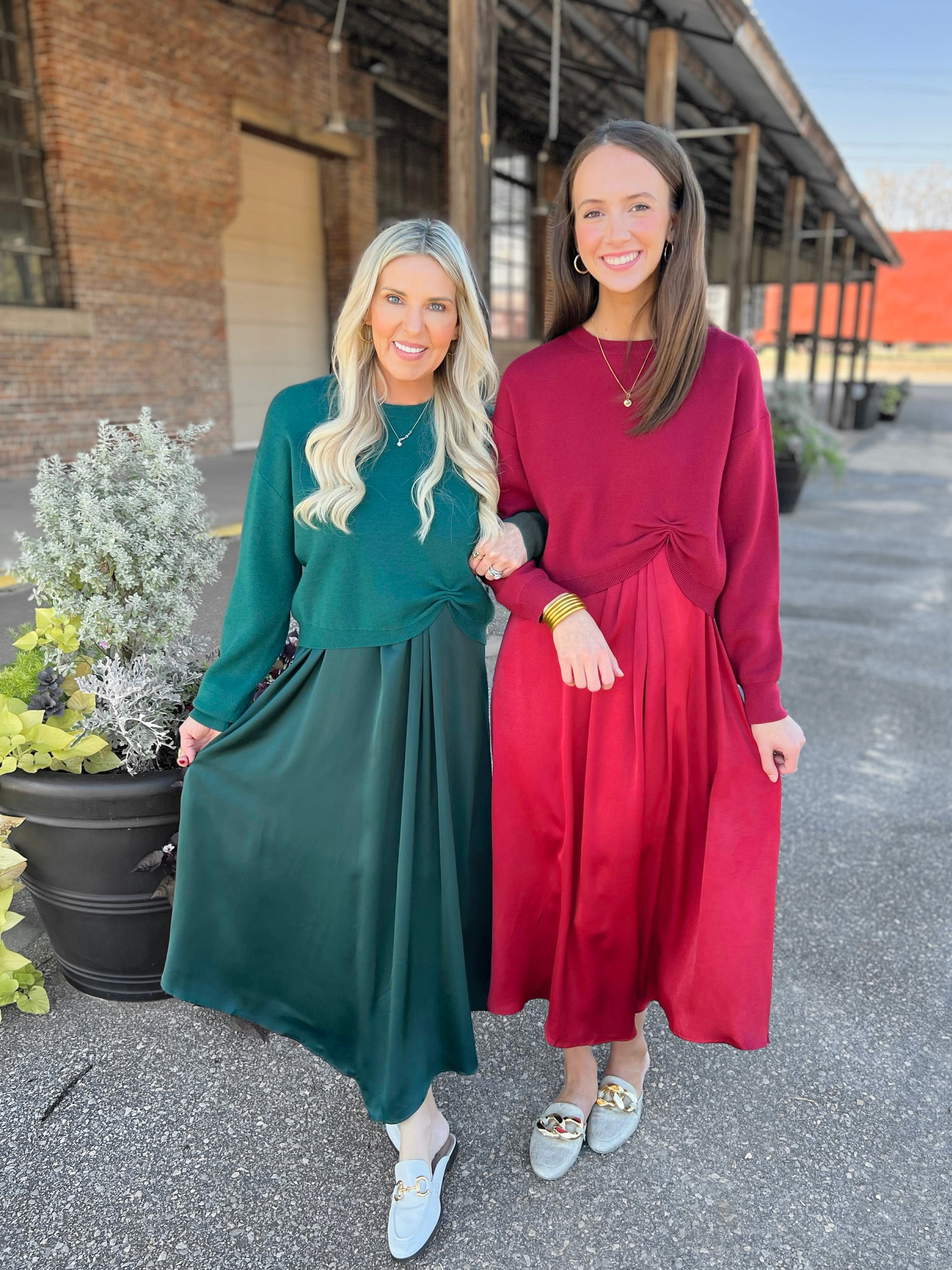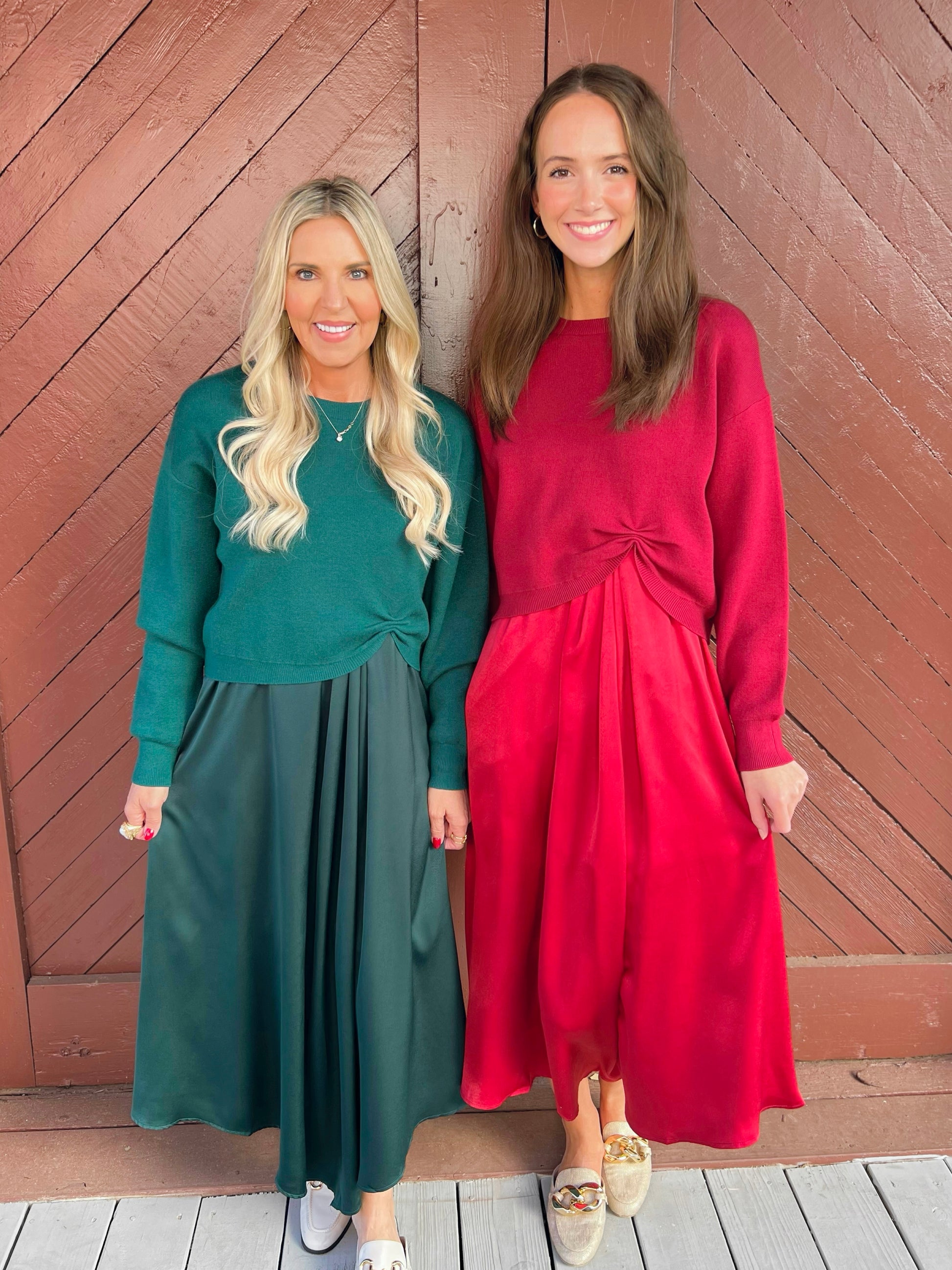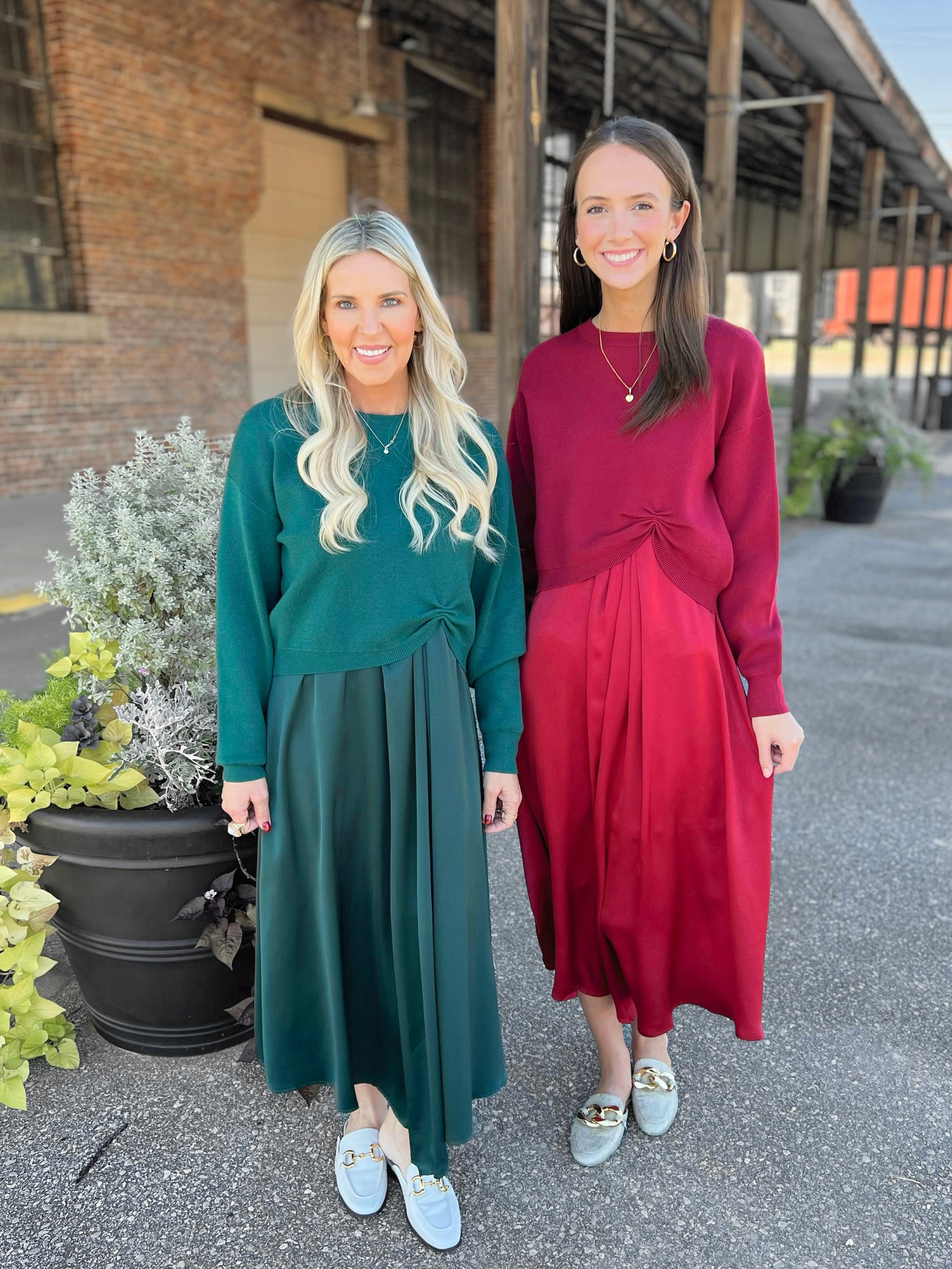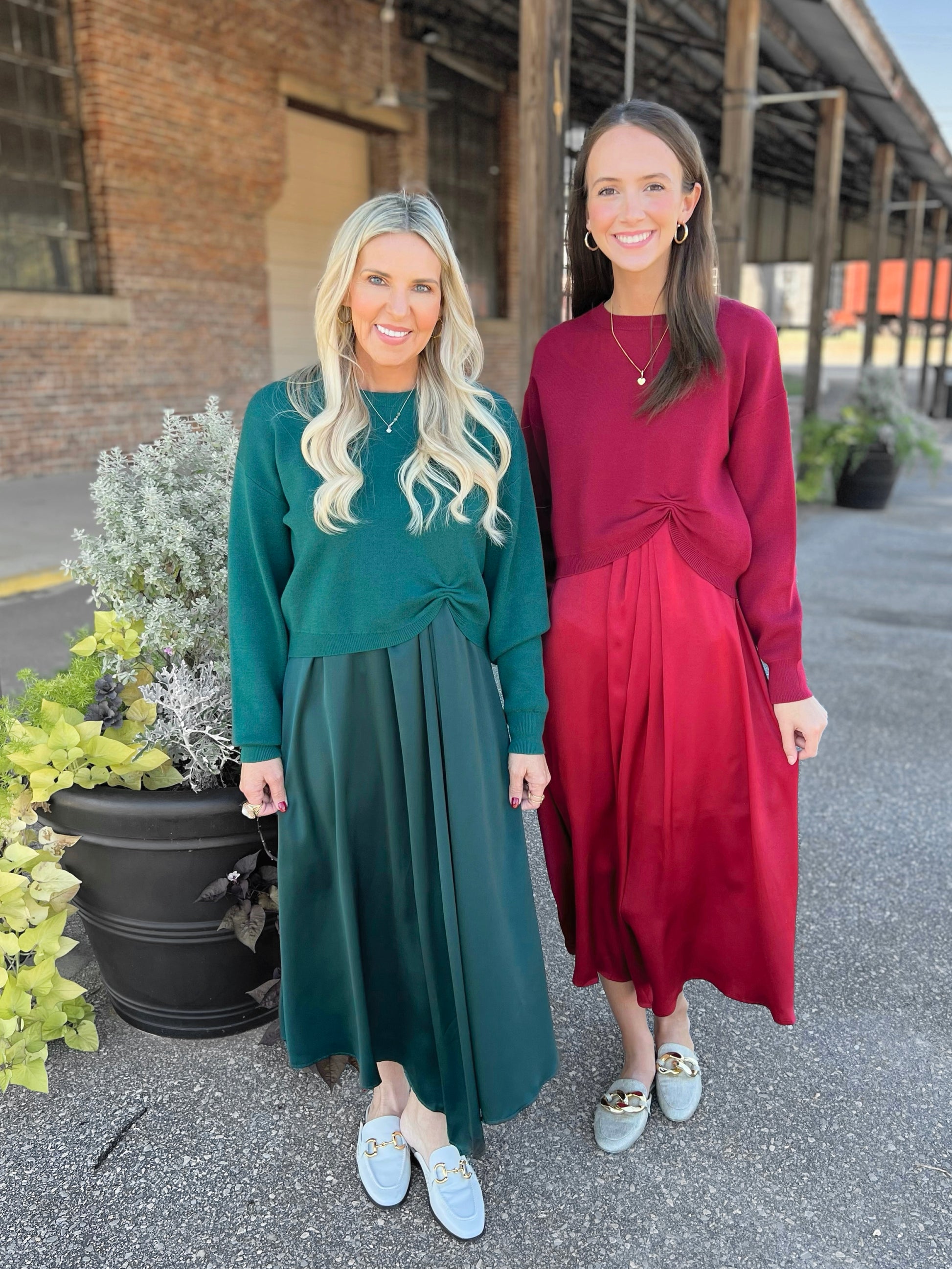 Includes a long sleeves soft texture sweater top with knot accent, drop shoulder.