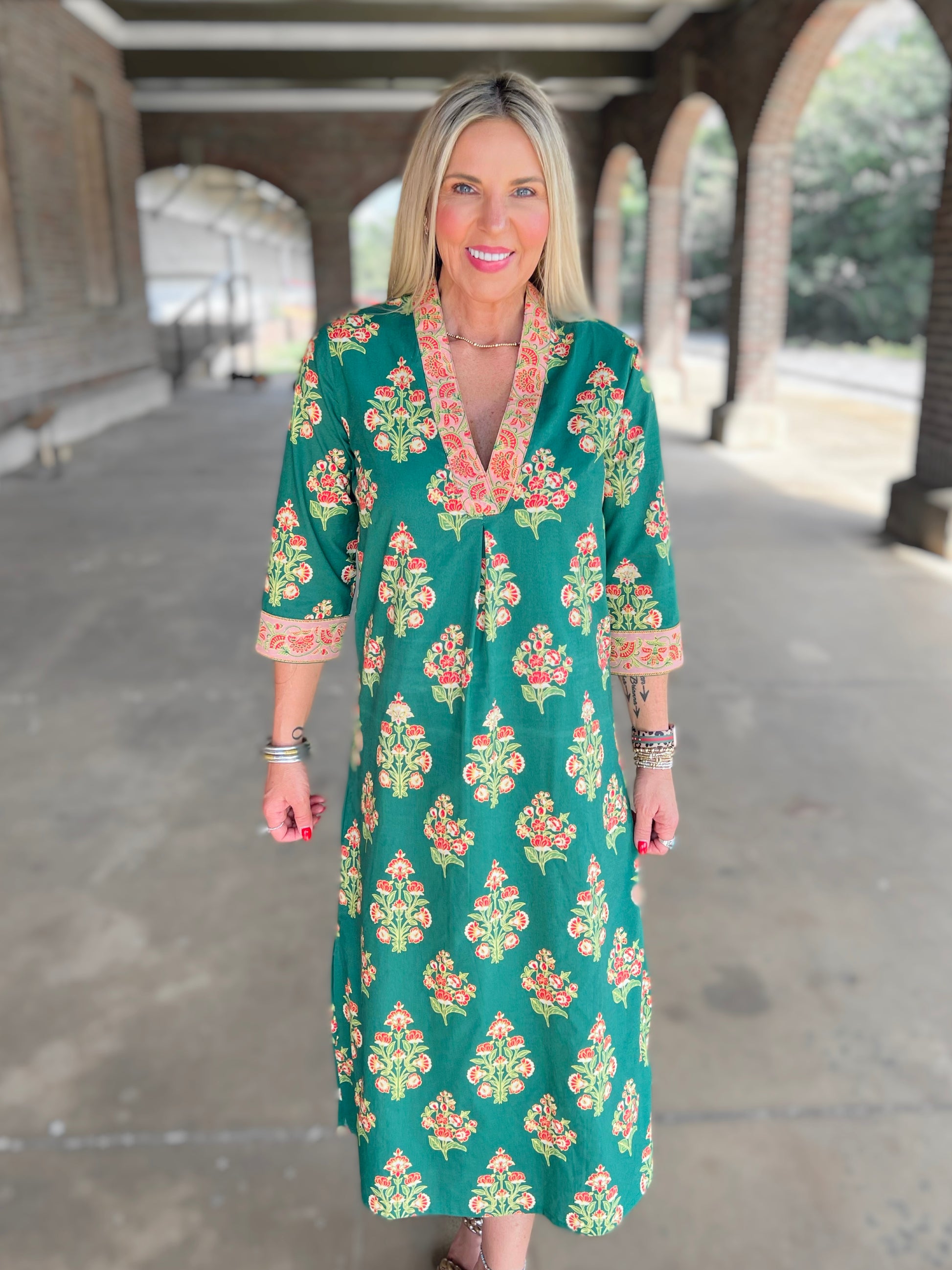 Juliette Caftan – Elodie Collection Step into the season with timeless elegance in our Juliette Caftan, designed in our exclusive Elodie print, featuring rich green, pink, and red hues. This beautiful combination makes it the perfect statement piece for fall gatherings, holiday celebrations, and everything in between. Crafted from soft, flowing cotton with a relaxed, flattering silhouette, the Juliette Caftan includes delicate side slits for movement and a relaxed fit for an effortlessly chic look. Whether you're dressing it up or lounging in style, Juliette brings grace and sophistication to any setting. Material: Cotton Elodie print (green, pink, and red tones) Relaxed, flowy silhouette with side slits