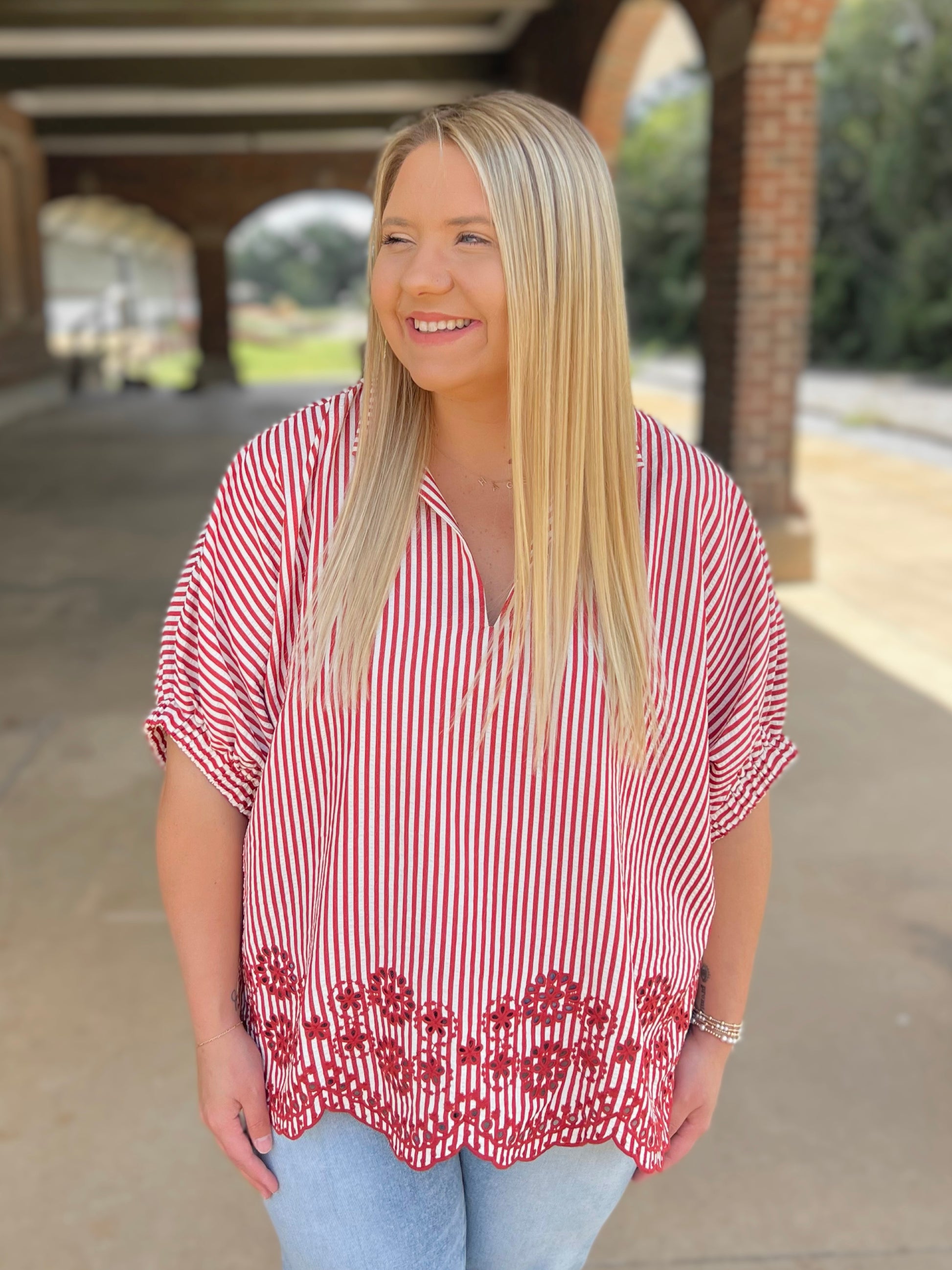 Striped short dolman sleeve top featuring split neckline and floral embroidered scalloped hem.