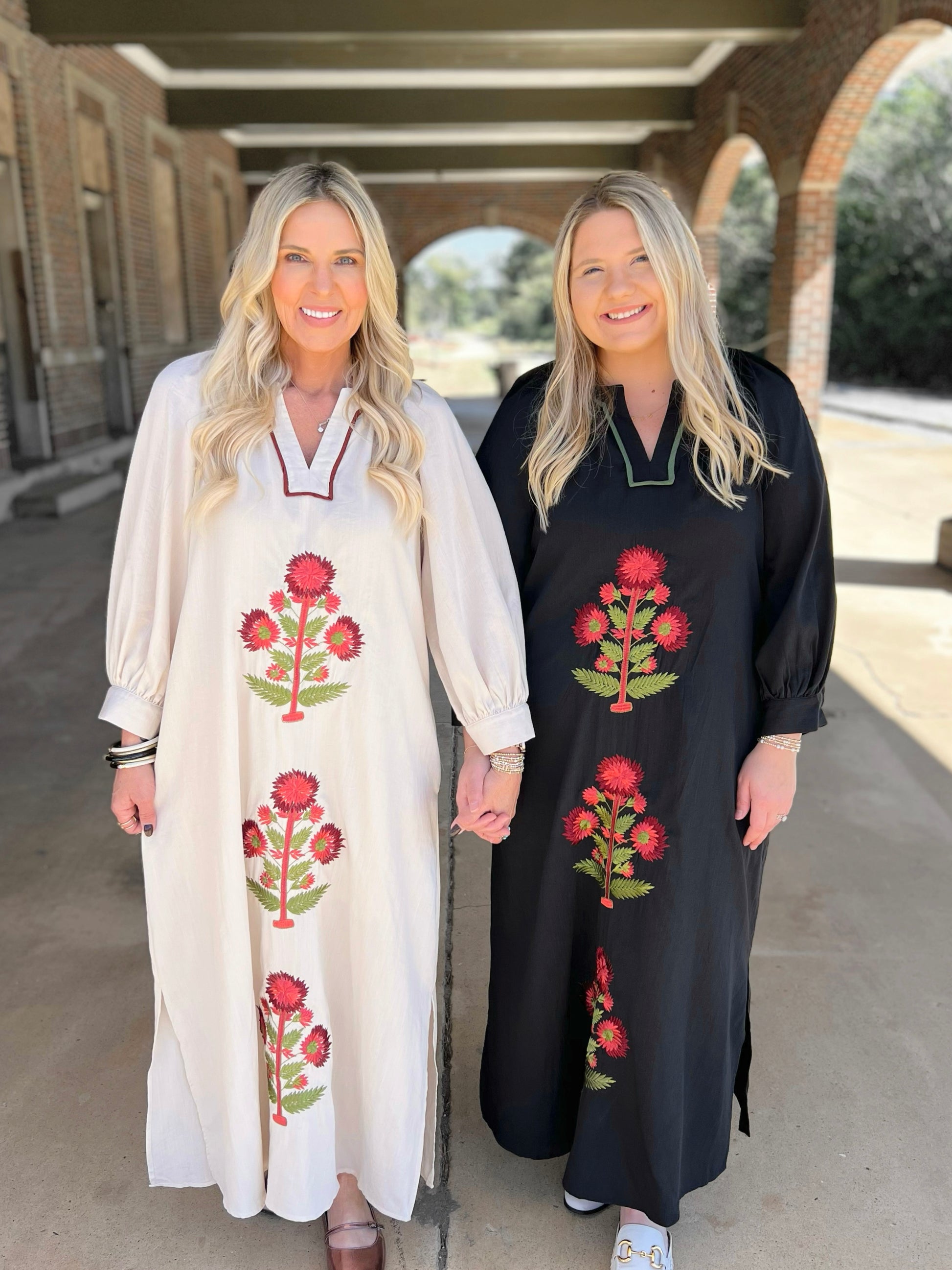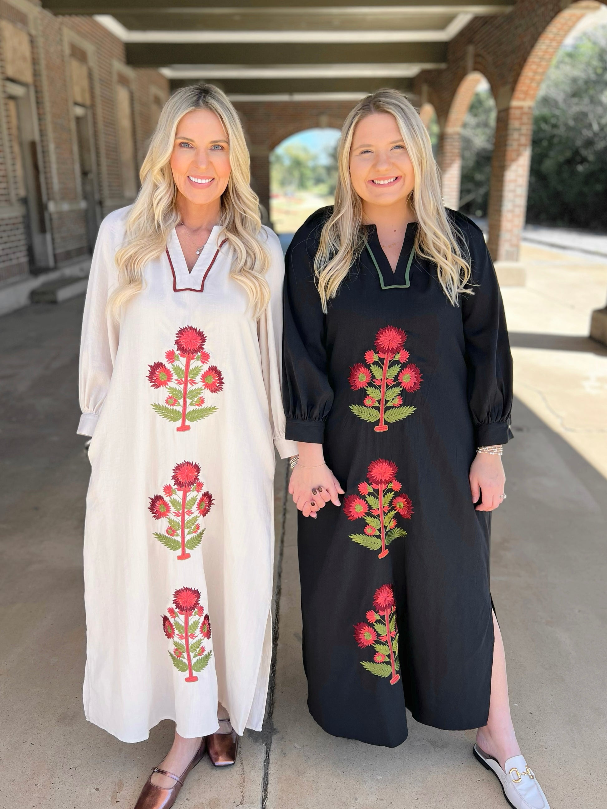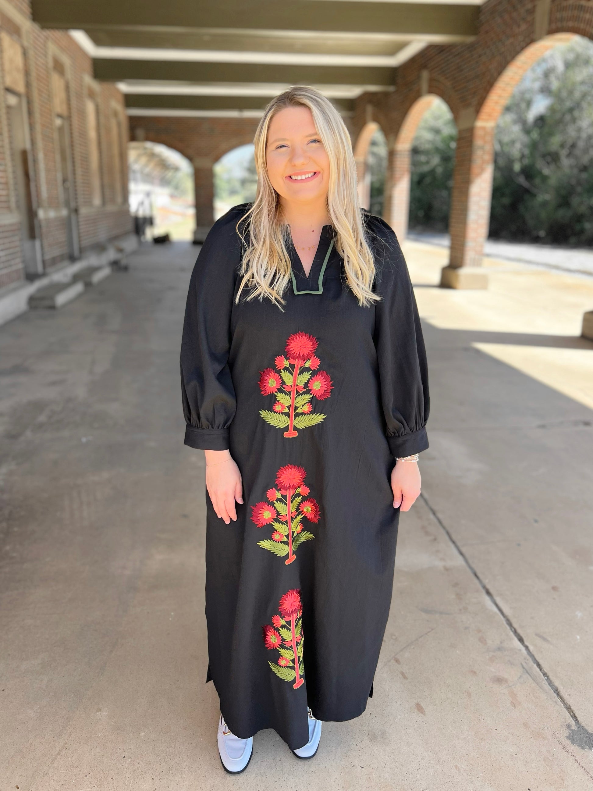Embroidered floral long sleeve maxi dress featuring contrast trim V-neck and side slits. Buttoned cuffs. Pocket at side. Lined. Woven. Non-sheer. Lightweight.