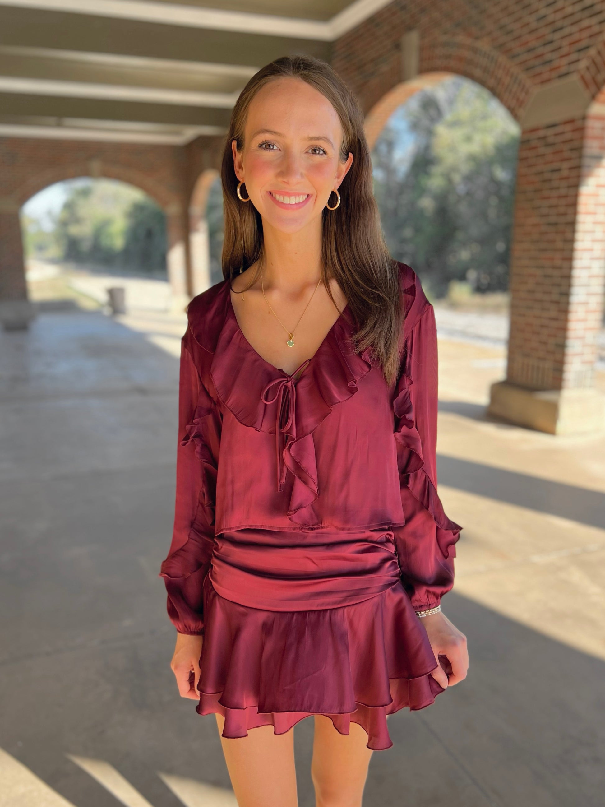 This ruffle detail long sleeve blouse is designed to bring a touch of elegance and romantic charm to your wardrobe. Made with a soft, lightweight fabric that drapes beautifully, it features cascading ruffle accents along the neckline, front, and sleeves for a feminine finish. The V-neckline with a tie detail adds subtle allure, while the relaxed bodice flows into a slightly gathered hem that pairs effortlessly with both skirts and pants. Its long sleeves are finished with elastic cuffs for comfort and ease of wear, making it suitable for day-to-night styling. The layered ruffle hemline adds volume and a touch of romance, making it a standout piece for both day and night. Crafted in a lightweight fabric that flows beautifully, this skirt moves gracefully with every step.