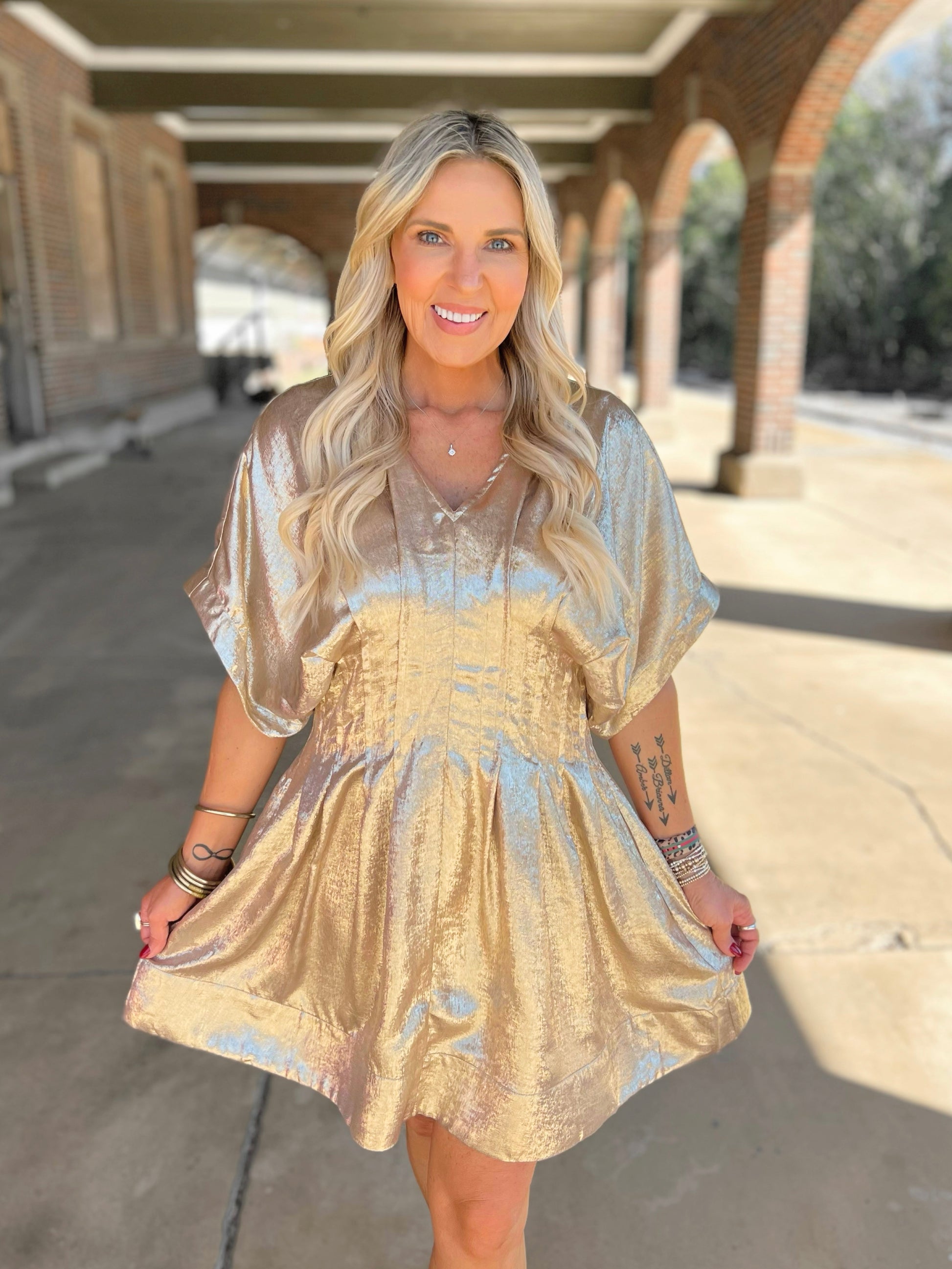 Metallic short dolman sleeve mini dress featuring pleated detail at front and back. Side pockets. Zipper closure at back. Lined.