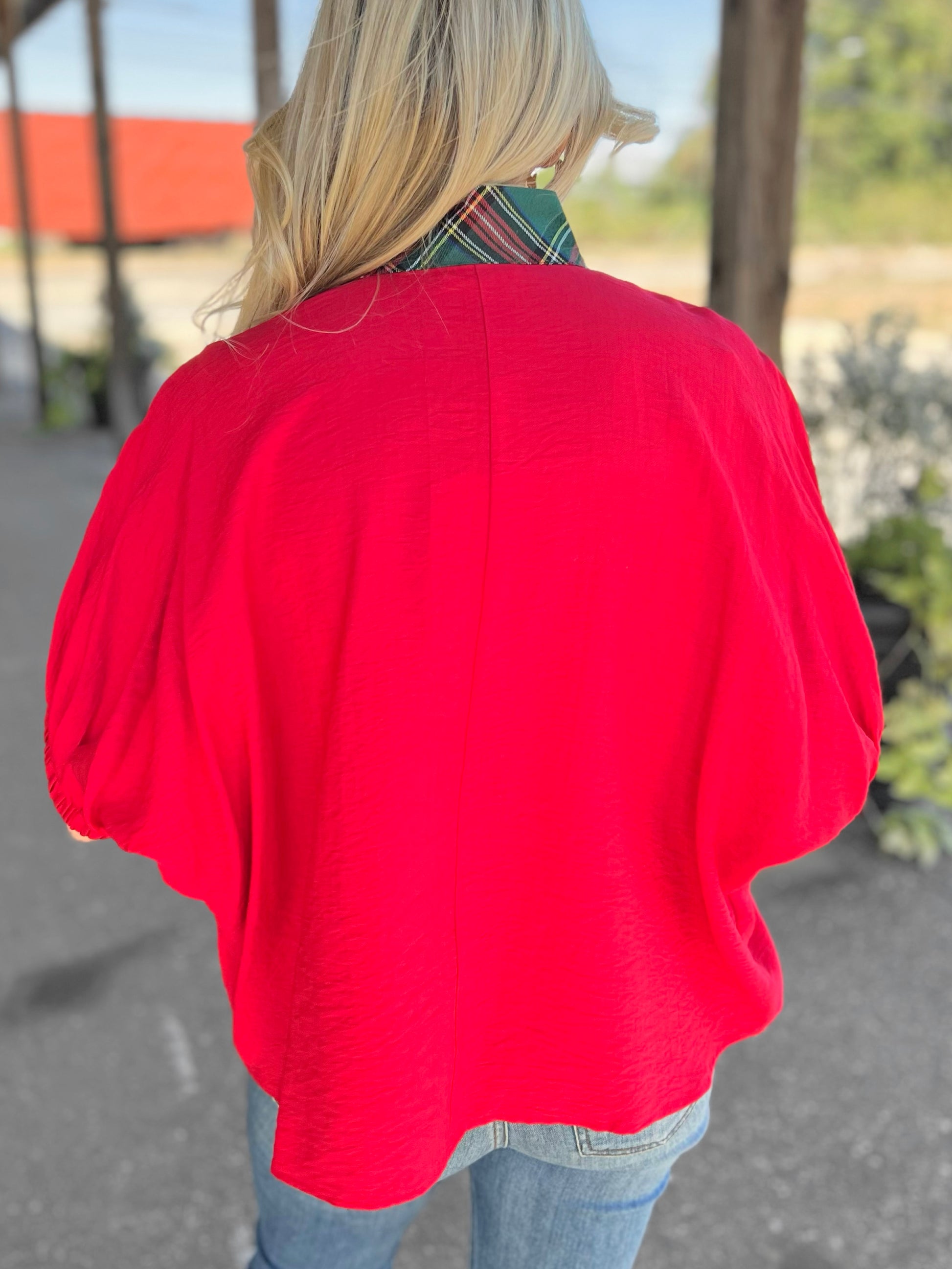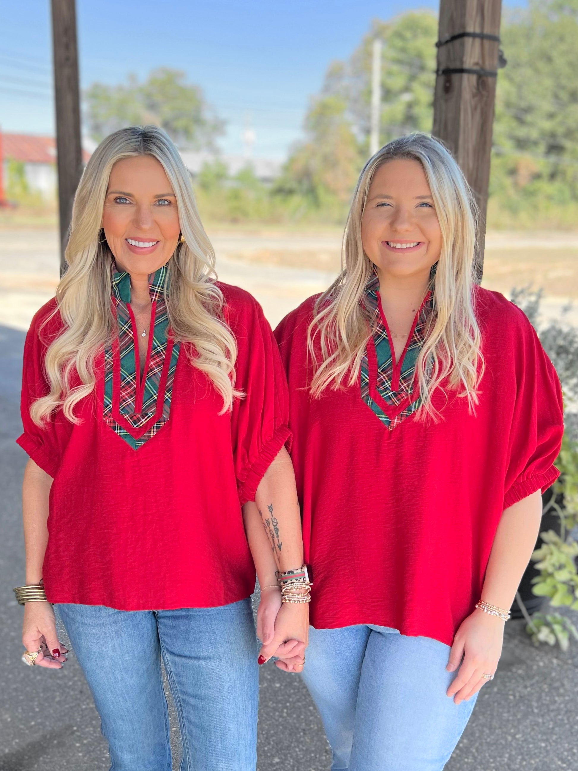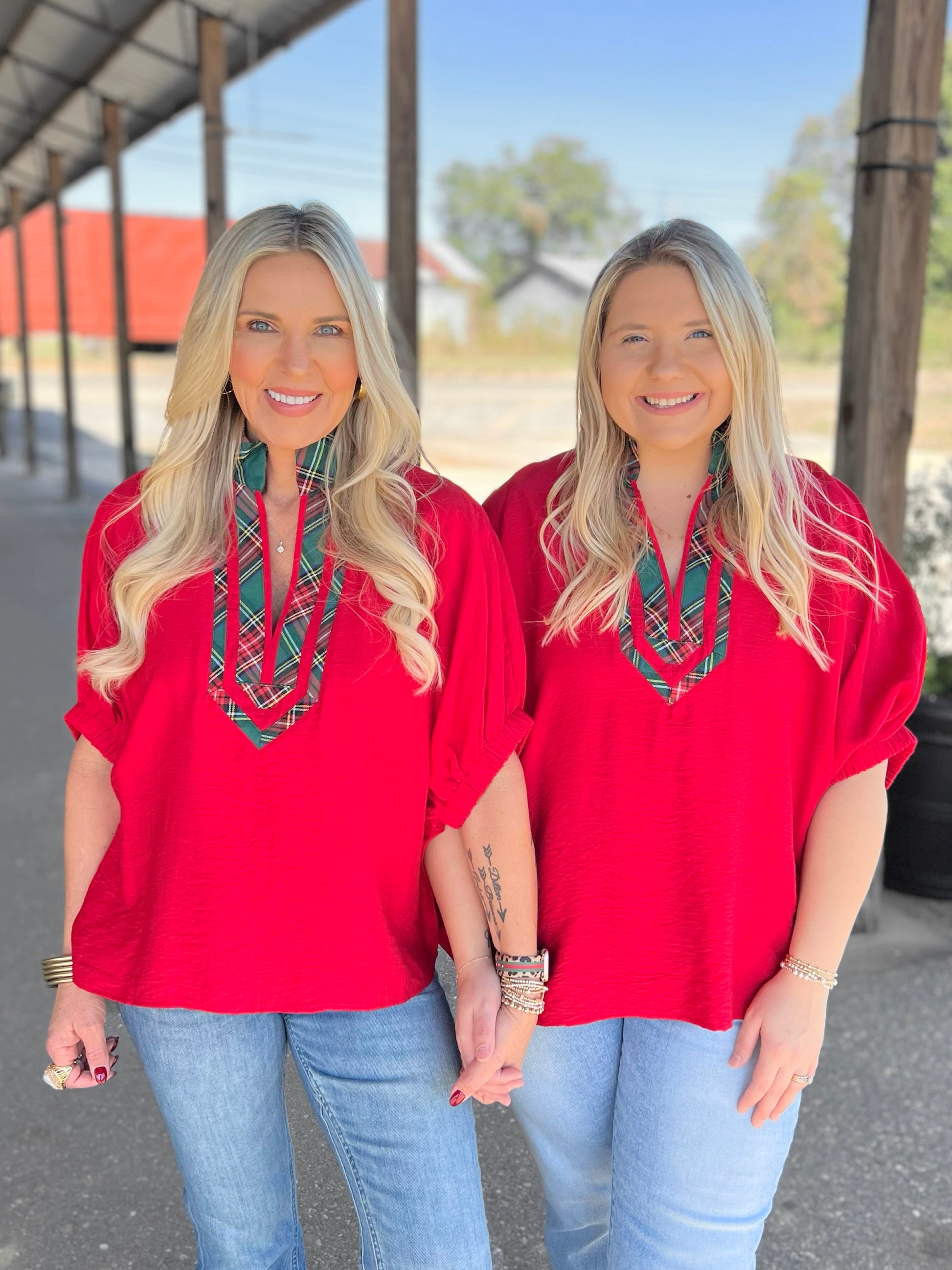 Solid short pleated puff sleeve top featuring contrast accent V-neck band. Unlined. Woven. Non-sheer. Lightweight.