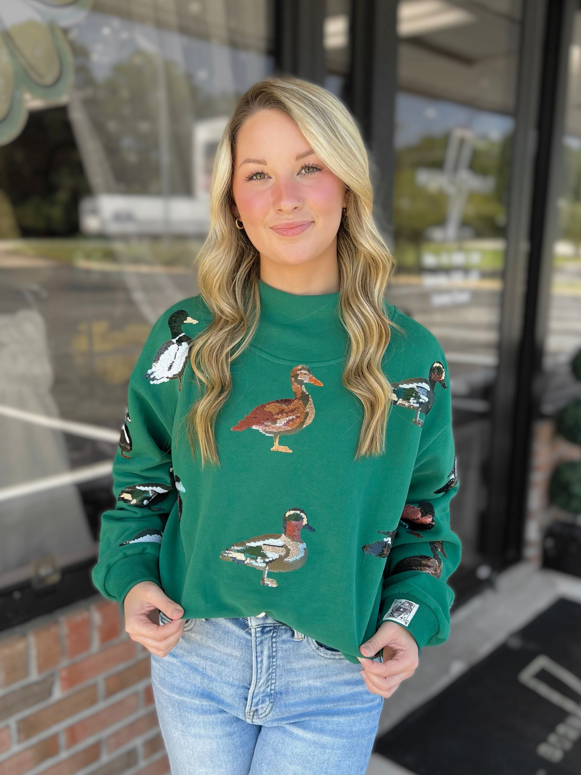 Mock neck sweatshirt covered with mallards. This style runs a tad smaller than your usual Queen sweatshirts. These run more tts!