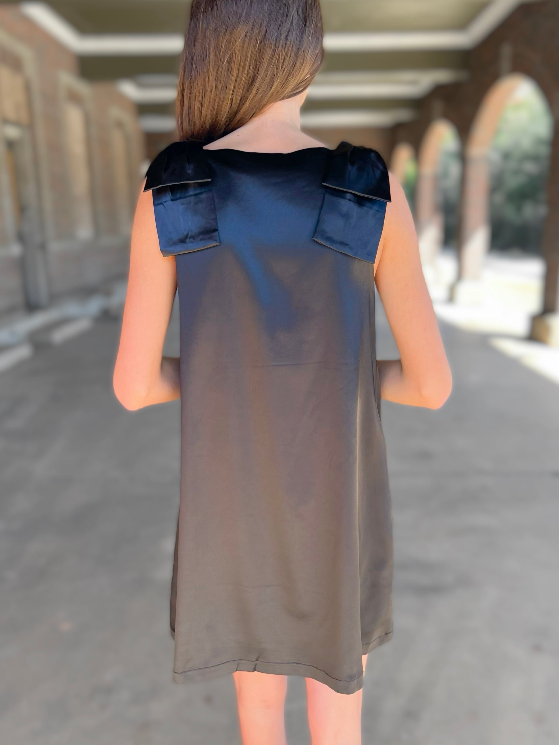 Solid sleeveless mini dress featuring bow detail at shoulders and V-neck. Side pockets. Lined. Woven. Non-sheer. Lightweight.