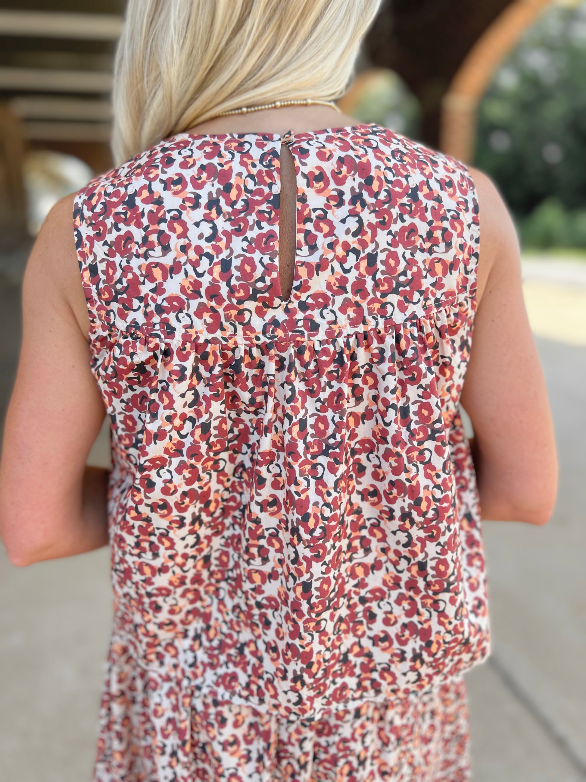 Abstract floral print sleeveless tiered top featuring a round neckline, pleated front, and a flowy silhouette. Keyhole closure at back. Runs tts. Matching skirt available.